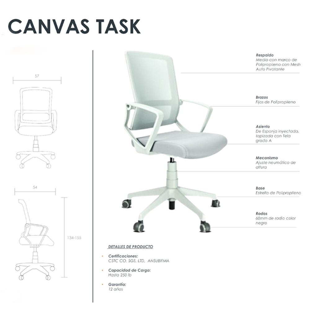Canvas Task es una silla operativa ideal para oficinas en casa, home schooling o espacios operativos. Cuenta con respaldo en mesh con mecanismo autopivotante, brazos fijos, ajuste de altura y base giratoria.