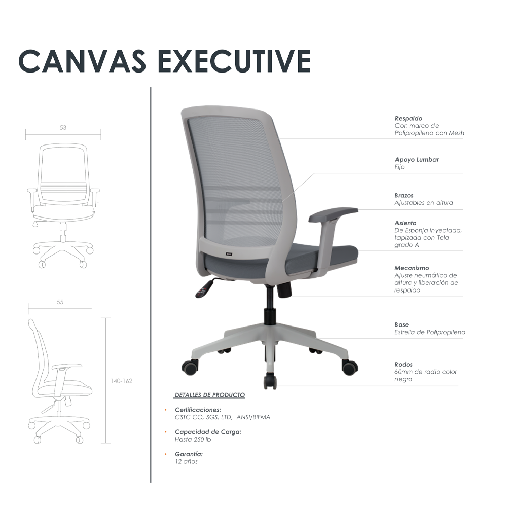 Canvas es una silla operativa ideal para oficinas en casa, home schooling o espacios operativos. Cuenta con respaldo en mesh con mecanismo basculante, apoyabrazos ajustables, ajuste de altura y base giratoria.